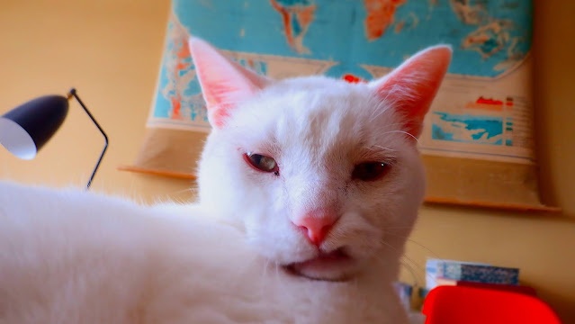 every time i pass juju laying on the table i flash the double peace signs and smile and he gives me his sloe-eyed snaggle-puss look.